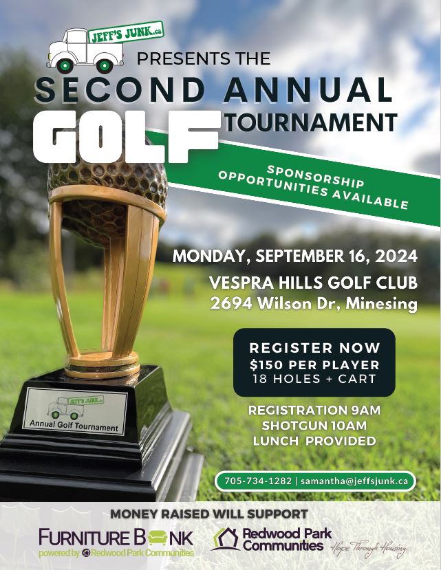 Jeff’s Junk Presents the 2nd Annual Golf Tournament Where Vespra Hills Golf Club, 2694 Wilson Dr., Minesing Map When Sep 16/24 09:00 AM - Sep 16/24 06:00 PM Age All