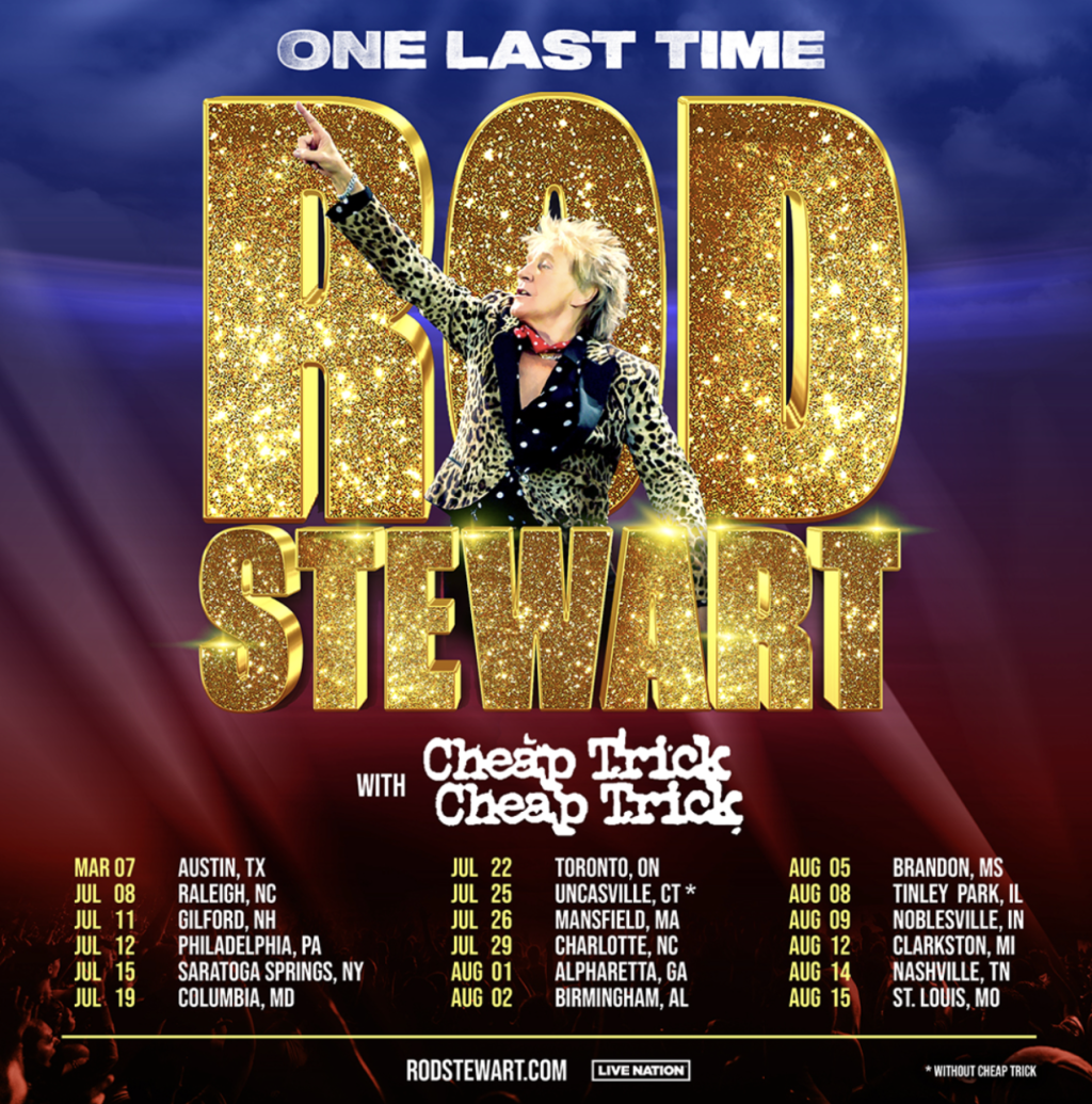 “One Last Time” will see Rod reuniting with fellow Hall of Famers, Cheap Trick, as his special guests. Their last outing in 2022 was a critical and fan favorite. Featuring chart-topping hits spanning Stewart’s unparalleled career, his hits-packed setlist includes songs like, “You Wear It Well,” “Maggie May,” “Da Ya Think I’m Sexy,” “The First Cut is the Deepest,” “Tonight’s the Night,” “Every Picture Tells A Story,” “Infatuation,” “Forever Young,” “Ooh La La (I Wish That I Knew What I Know Now),” ”Young Turks,” Have I Told You Lately That I Love You,” “Rhythm of My Heart,” “Broken Arrow,” “Forever Young,” and many more.