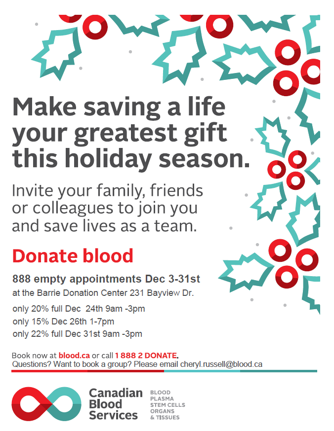 Blood Donor Clinic Where Barrie Donation Centre, 231 Bayview Dr., Barrie Map When Dec 26/24 01:00 PM - Dec 26/24 07:00 PM Age All Website blood.ca