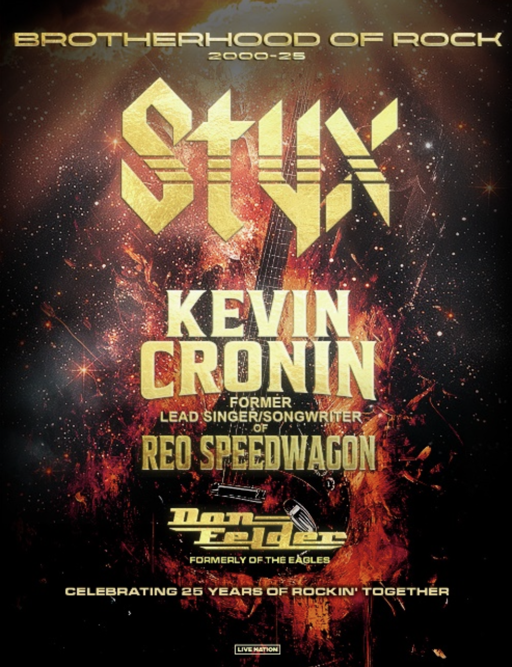 December 6, 2024 – Legendary rockers Styx and Kevin Cronin, the iconic voice and writer behind REO Speedwagon’s greatest hits, have one of the strongest brotherly bonds spanning 25 years, especially since they’ve crossed paths on the North American concert trail along with the occasional joint festival concert. Fittingly, next summer they’ll join forces for the sixth time for their “Brotherhood of Rock” tour, along with special guest Don Felder (a former lead guitarist for the Eagles), that will kick off May 28, 2025 in Greenville, SC at the Bon Secours Wellness Arena.