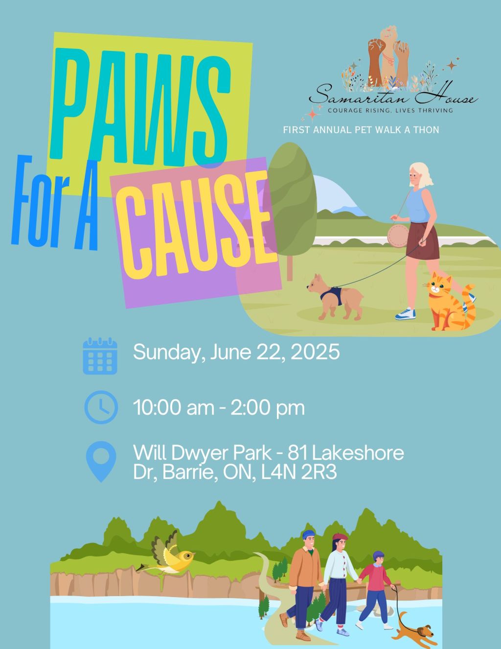 Join us on Sunday, June 22, 2025, from 10 AM to 2 PM at the Barrie Waterfront – Will Dwyer Park for the First Annual Pet Walk-a-Thon!