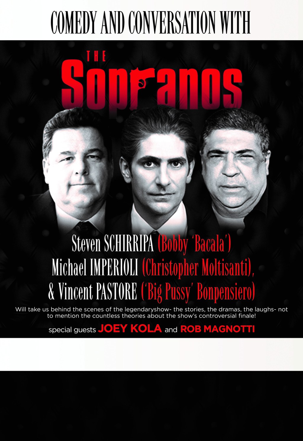 Join Steve Schirippa, Vincent Pastore and Michael Imperiol for comedy and conversation with the Sopranos; go behind the scenes to hear about the stories, the dramas, the laughs and countless theories about the controversial finale of the show.  Find out anything you wanted to know about the Sopranos including a Q&A with the audience.