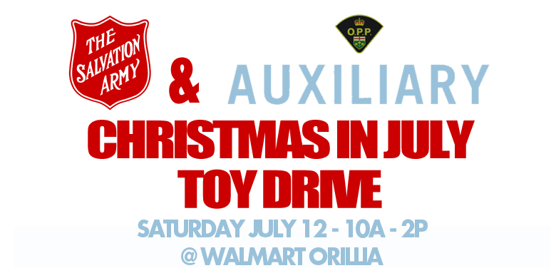 The Orillia O.P.P. Auxiliary Unit is partnering with the Orillia Salvation Army once again in Orillia for a Christmas in July Toy Drive Saturday July 12th from 10am – 2pm at the Orillia Walmart.