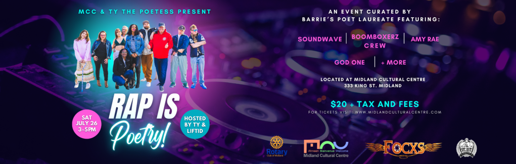 “Rap is Poetry” Event curated by Barrie’s Poet Laureate, Ty the Poetess on July 26th from 3-5pm.